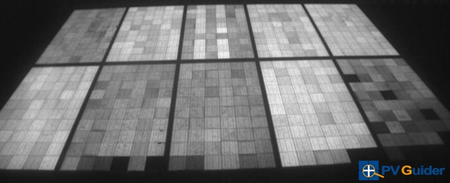 下圖是一個EL影像的例子,照片中黑暗不發光的區域就是電流無法到達的區域,該區域被裂縫完全包圍封閉,也就是說在陽光下該位置所發的電也無法傳出來使用。因此,EL影像裡黑色的「壞死區」可以當作是無法發電的區域,而顏色較灰暗的「未完全壞死區」,跟週邊仍然有微微相連,少量電流可以通過,表示在陽光下可發電但傳出時會有損失。至於黑色裂紋狀的線條,表示電池片有破裂,但是裂縫兩側還互相接觸,所以電流仍然可以通過。這種裂紋是肉眼不可見的,所以又稱為「隱裂」。隱裂通常會隨時間而成長變長,裂縫也會越來越分開,導致發電損失逐漸增加。